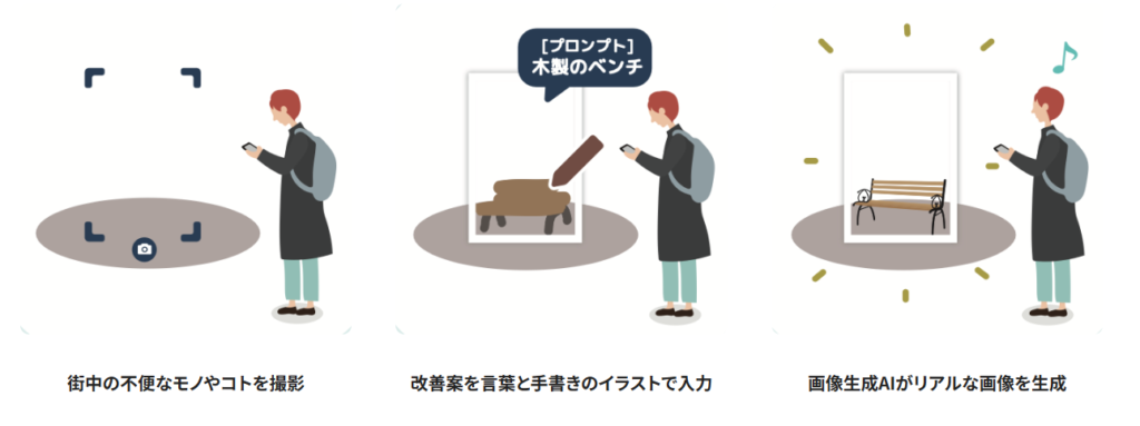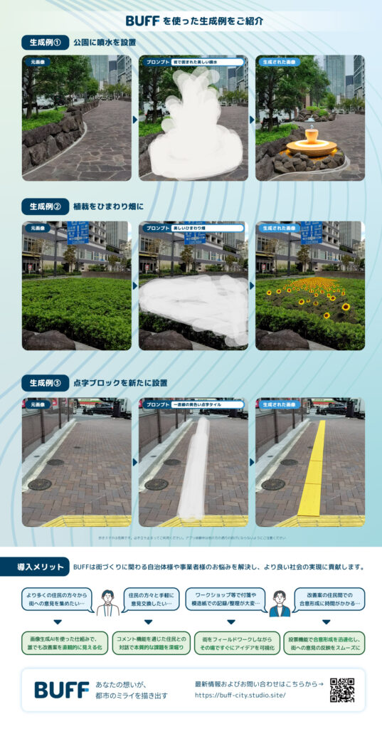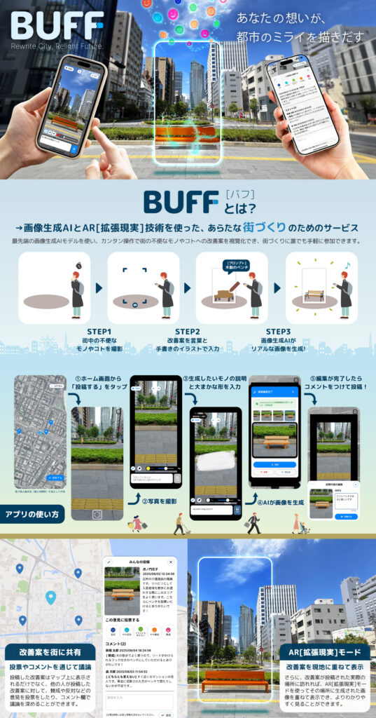 「BUFF」は街づくりに関するアイデアをプロンプトと手書きのイラストを基に生成AIによって手軽にビジュアル化でき、 それらのアイデアを共有して地図やARで見られるだけでなく、賛成/反対スタンプやコメントを介して利用者同士で議論を深められる、ボトムアップ型のあらたな街づくりのためのツールです。